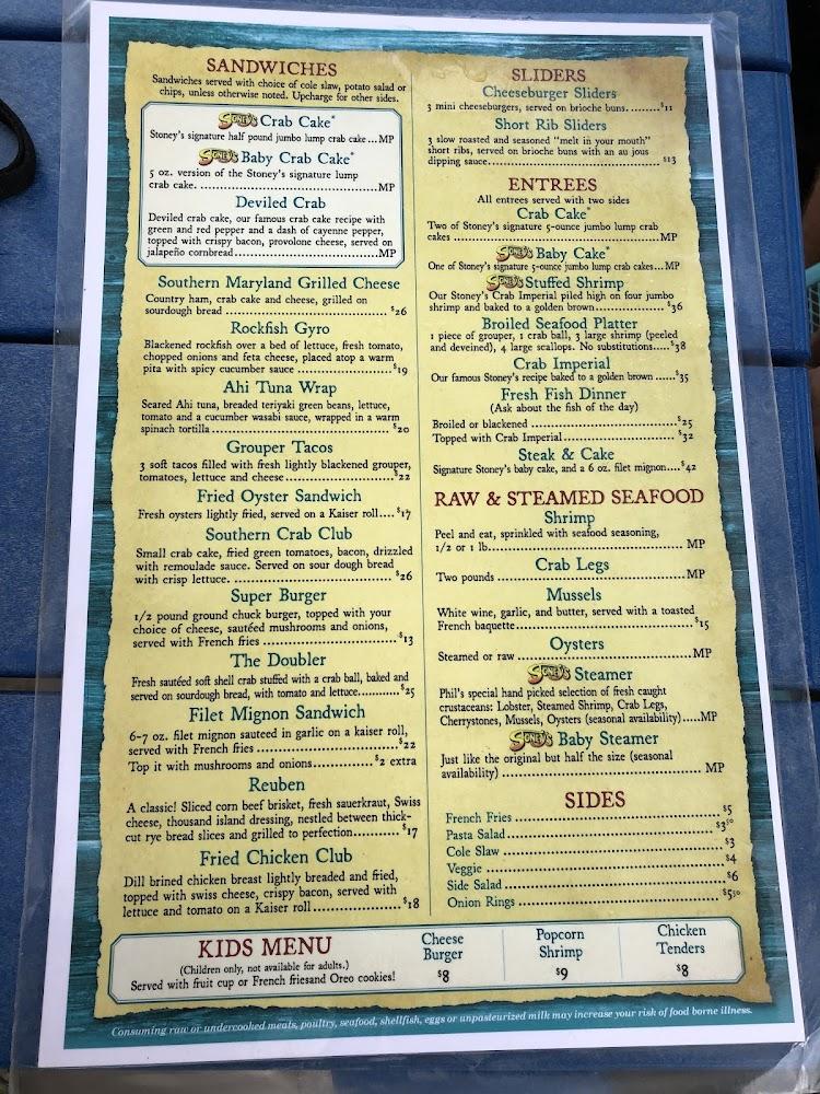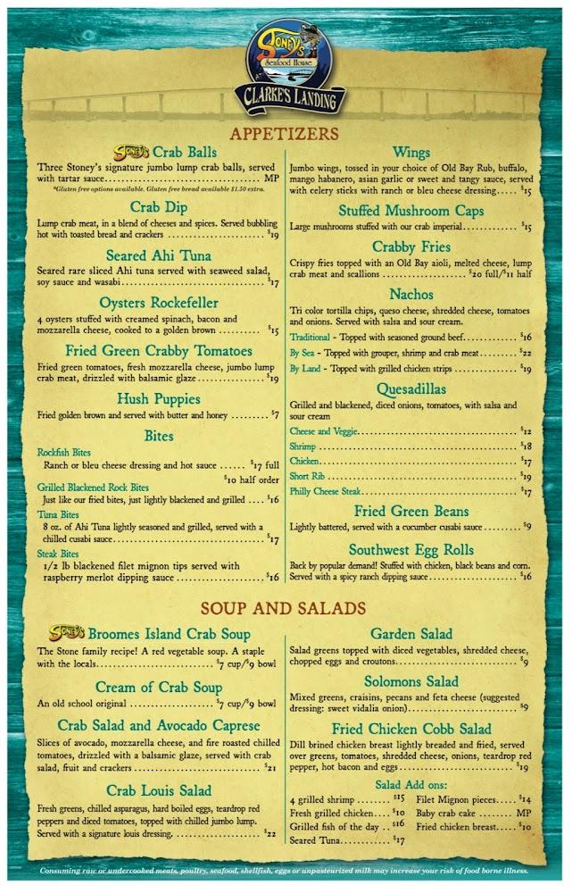 Stoney's Seafood House menu features a wide array of seafood options. Popular appetizers include crab balls and calamari. Soups like Maryland crab soup are house favorites. Salads showcase fresh ingredients and include a Caesar option. For the main course, diners can enjoy dishes like snow crab legs and stuffed shrimp. Various sides complement each dish, enhancing the overall flavor. Dessert options provide a sweet ending, with items like triple chocolate cake. Overall, the menu reflects a commitment to local seafood and traditional American flavors.